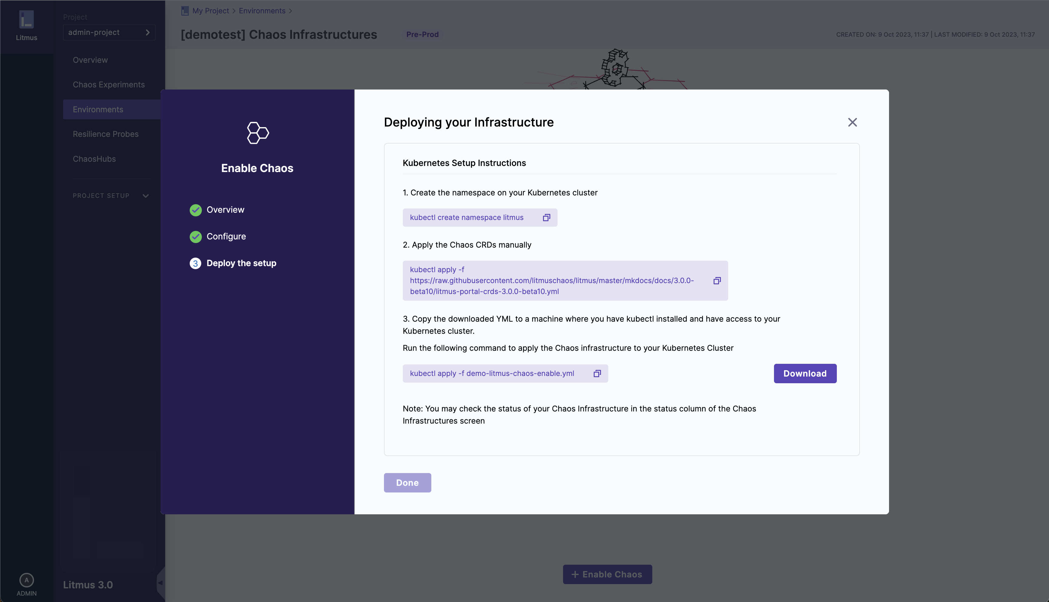 kubectlcommand to apply the chaos CRDs. - Select Download, and then copy and run the third command to install the chaos infrastructure.